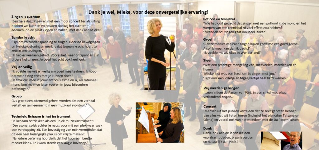 ‘Een hele dag zingen en met een mooi concert ter afsluiting hebben we kunnen volhouden dankzij het zuchten – ademen- op de plaats lopen en ballen, met dank aan Mieke!’