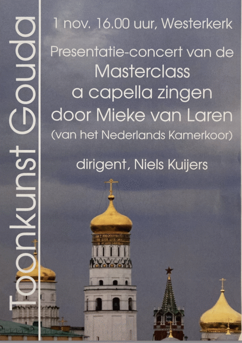 Een van de leuke dingen aan het zingen bij het Nederlands Kamerkoor is dat het je meer brengt dan uitvoeringen op het concertpodium. Zo gaf ik begin november namens het NKK een Masterclass a Capella Zingen aan Toonkunst Gouda. Het koor koos in uit de geboden opties vijf-en-een-half uur werken aan o.a. muzikaliteit, ensemblevorming en stemtechnische vaardigheden. Bij deze begrippen kun je denken aan vragen over de juiste vorming van klinkers, homogeniteit in de koorklank, intonatie, makkelijk hoog zingen en omgaan met de betekenis van tekst. De oefeningen die ik naar aanleiding van ‘de vragen over’ met ze deed leidden tot weer nieuwe vragen en muziekonderwerpen. Een van die vragen ging over zingen is spreken op toonhoogte, waarover ik op mijn blog al eerder schreef. De zangers ervoeren dat ze stem hebben en stem zijn, wat luisteren is, en dat ze sprekend zichzelf kunnen zijn… mijn motto!